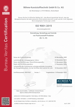 Im Sinne des Unternehmenserfolges kann eine gute Gesamtqualität unserer Leistungen und Produkte nur erreicht werden, wenn die Qualität unserer Prozesse hoch und auf den Firmenerfolg ausgerichtet ist, ständig überwacht und gegebenenfalls verbessert wird. Aus diesem Grund lassen wir uns Entwicklung, Herstellung und Vertrieb regelmäßig nach DIN EN ISO 9001 zertifizieren.